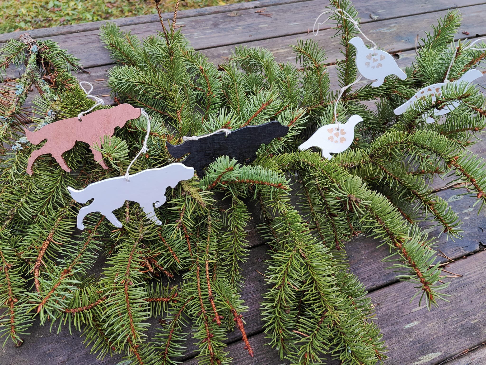 Gordoninsetterijaokselta saa taas joulun kuumimpia ja piirteikkäimpiä joulukoristeita. Tilaa pikaisesti, jotta paketti ehtii jouluksi perille. Koristesetti sisältää koiran (punainen, valkoinen tai musta) ja kolme riekkoa. Hinta 12 € + postikulut.